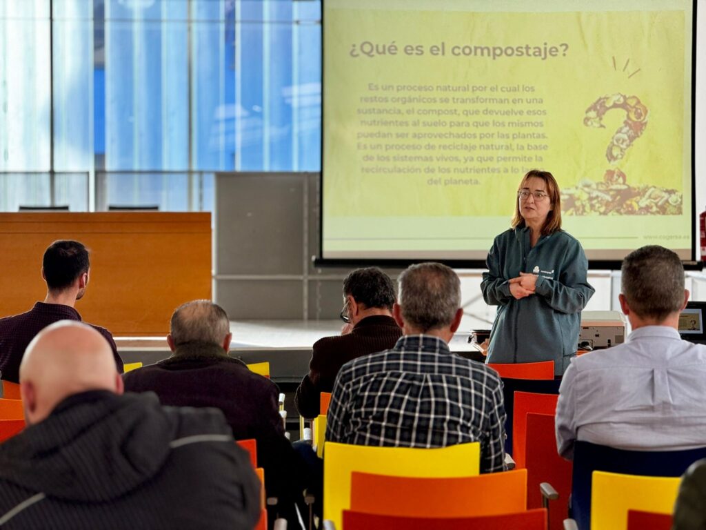 La charla dura algo más de una hora y en el transcurso de la misma se abordan todas las instrucciones básicas que hacen relación a la correcta separación de los residuos orgánicos que pueden dejarse en el contenedor, su combinación, en proporción adecuada, con estructurante (madera triturada), y el proceso de supervisión continua que ha de darse a la humedad y la aireación de la mezcla.